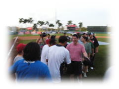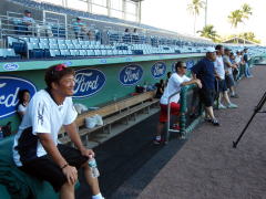 さて、午後は、昨年から恒例となった、「日米対抗メディア関係者によるソフトボール」、なんと、本球場にフェンスまでセットして、超ゼイタクな環境。