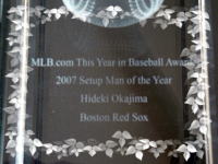 昨年度の最優秀セットアッパー(ファンが選ぶベストセットアッパー)のトロフィーをいただききました。 クリスタル ガラスでとても綺麗です。 フェンウェイパークのフィールドで表彰されて、とてもうれしかったです。 パペルボン(クローザー賞)と、ベケット(先発賞)、バックホルツと一緒に表彰さました。 今年もがんばらなくては!